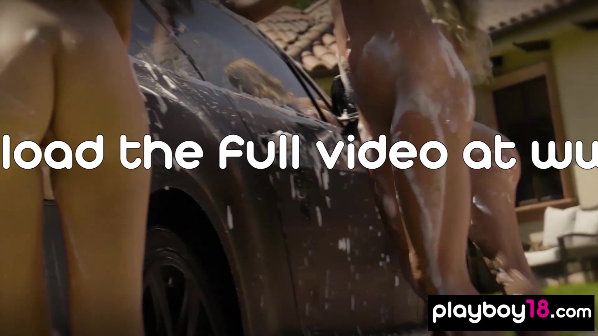 Exotic nude asian babe Ocean and her big boobed GFs washing a car outdoor