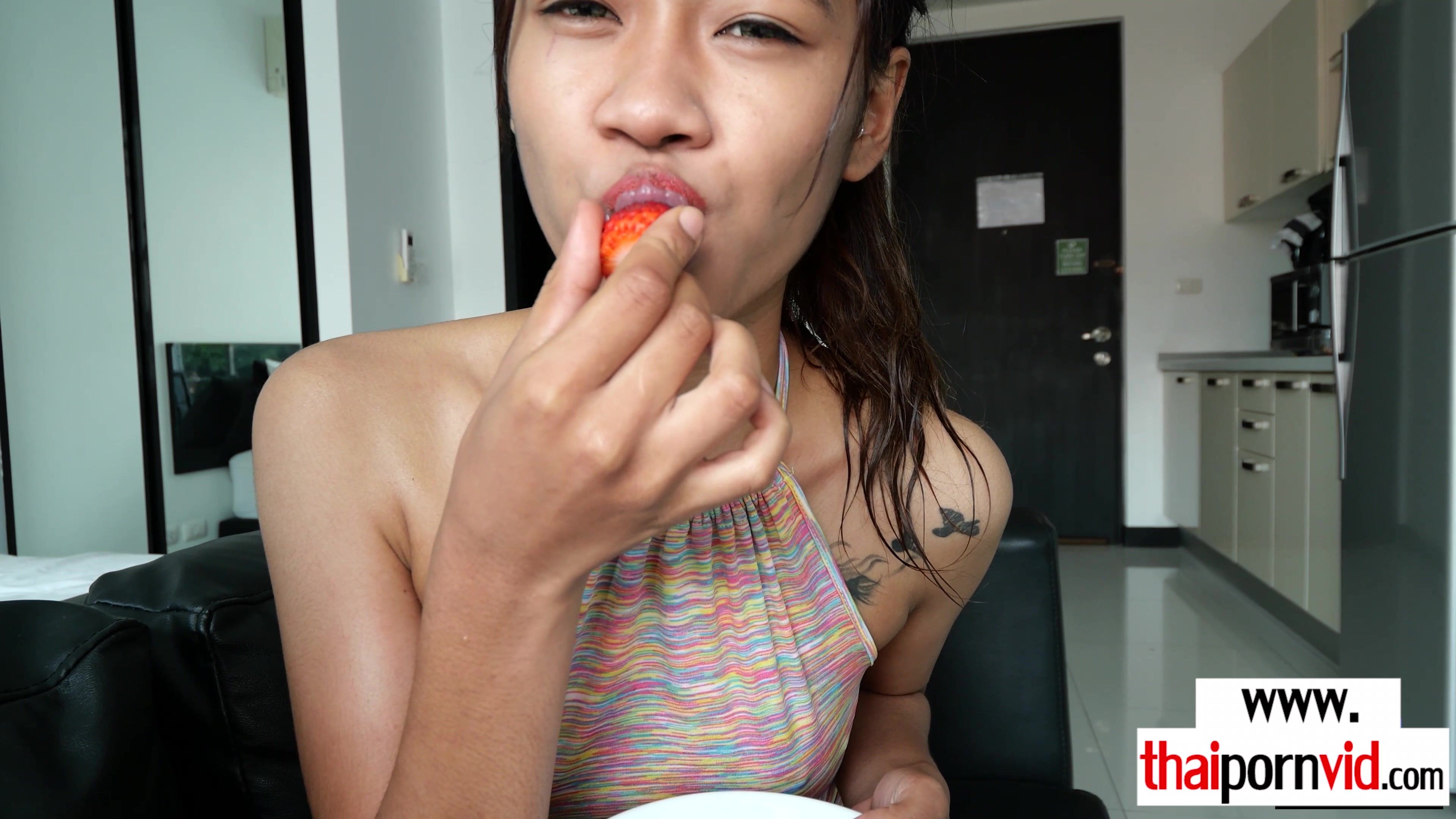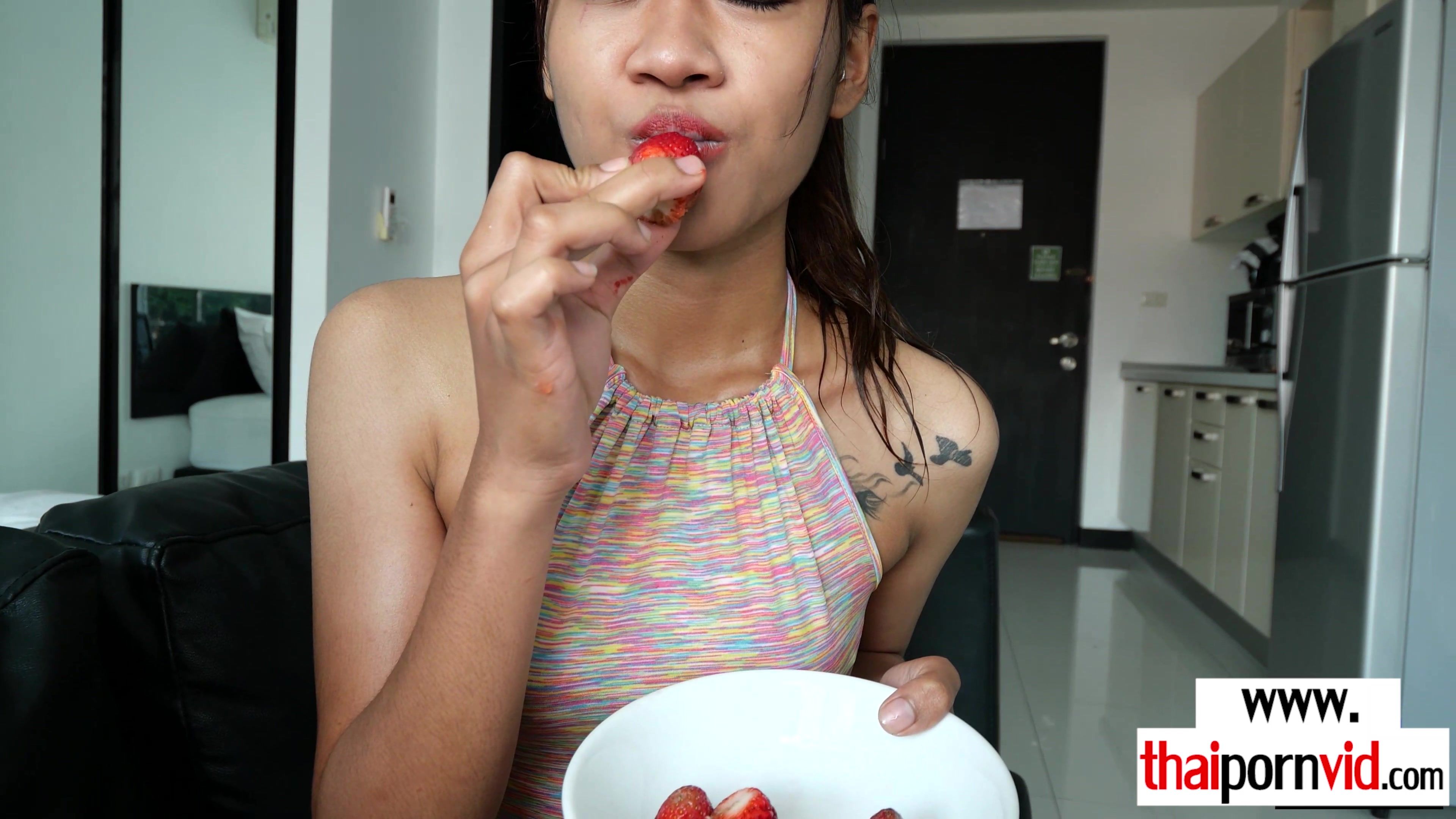 Petite amateur Thai teen Baytey with small tits is eating strawberry and resting on the couch by her european lover She wants make her day better so she grabs his big white cock