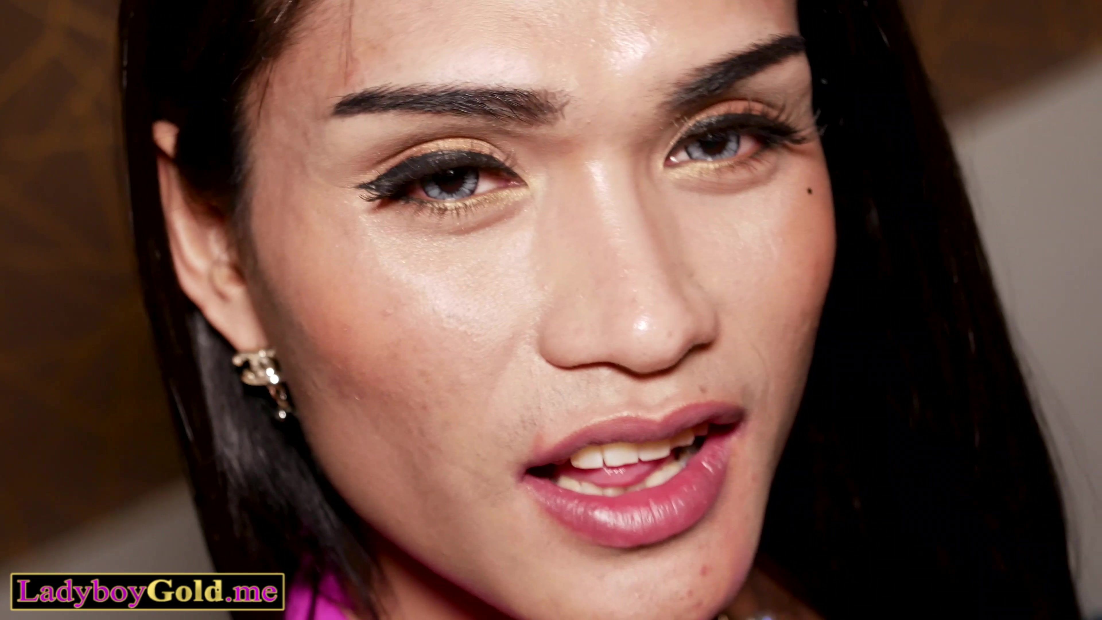 Skinny amateur Thai ladyboy teen Nokyung with tiny tits is smiling on the bed in a netted pink dress She bends over and offers her tight asian asshole for fuck to a perv farang who wants a proper blowjob then he is banging her hot ass bareback